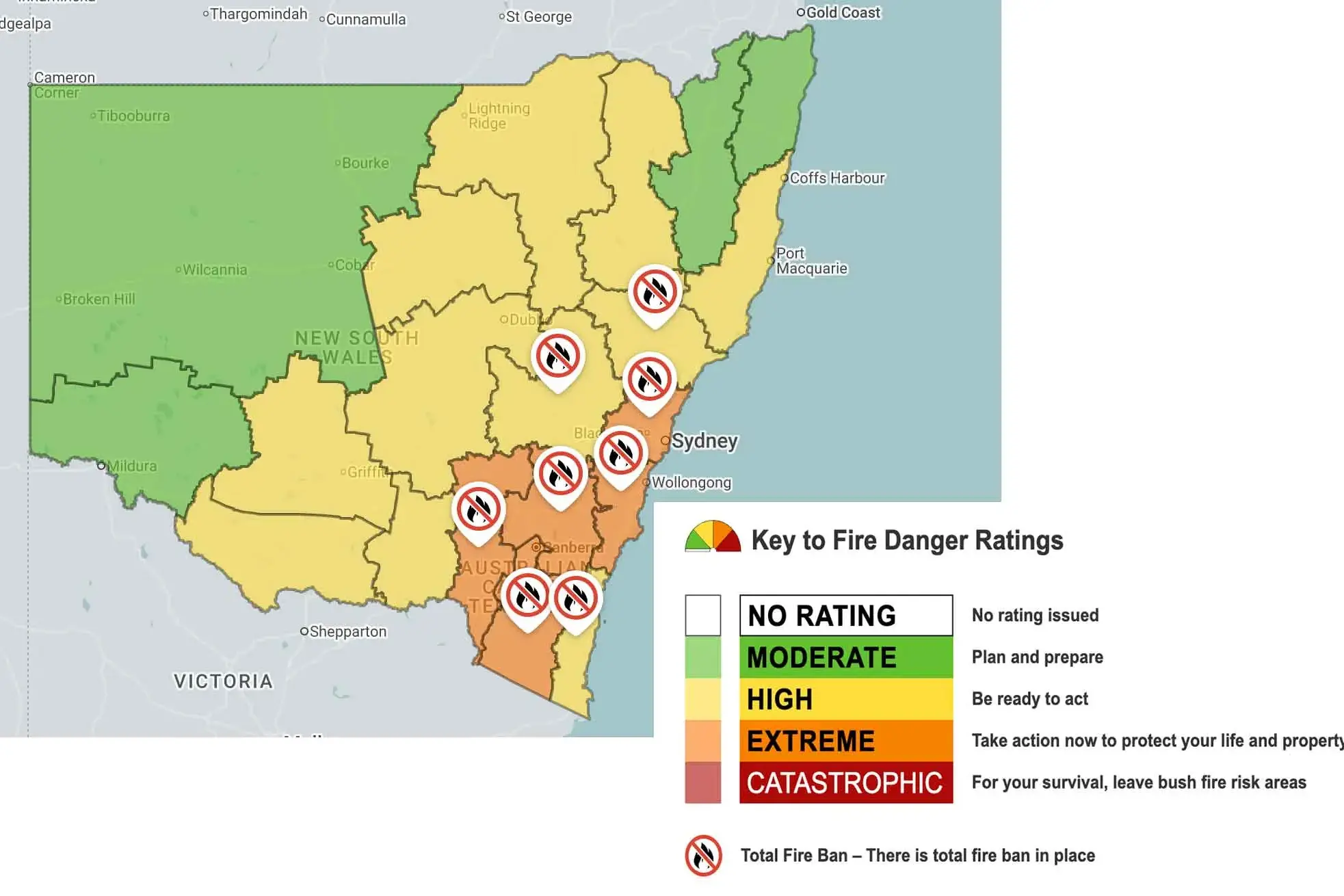 A Total Fire Ban commenced at midnight for Saturday for multiple areas including the Central Ranges, where the Fire Danger is High. That includes the council areas of Bathurst, Blayney, Cabonne, Cowra, Lithgow, Mid-Western, Oberon and Orange.
